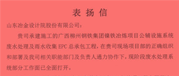 近日,公司總承包的廣西柳州鋼鐵集團鎳鐵冶煉項目公輔設(shè)施系統(tǒng)廢水處理及雨水收集工程項目部收到業(yè)主表揚信,稱贊項目部在安全、...