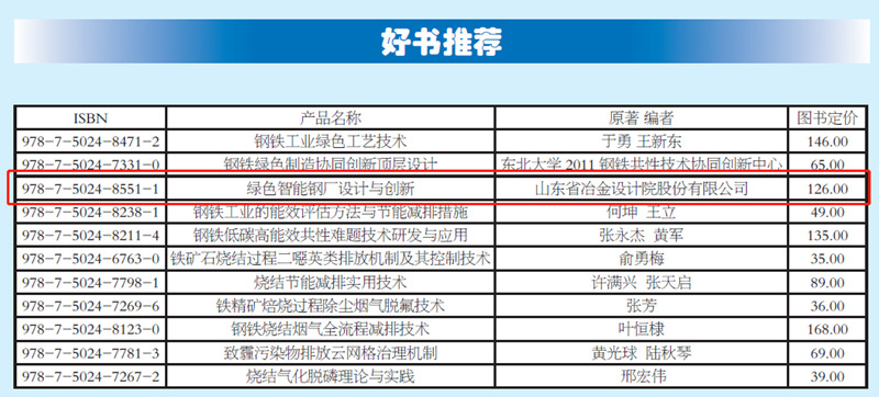 冶金工業出版社、世界金屬導報社等面向全國讀者推薦了我公司編著的《綠色智能鋼廠設計與創新》。