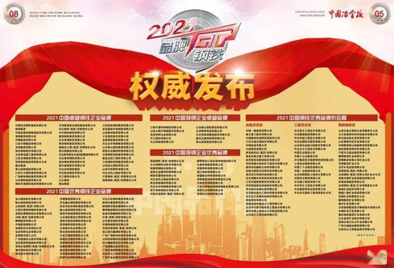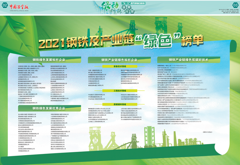 近期中國冶金報公布了2021年度中國鋼鐵品牌企業(yè)和2021年度鋼鐵及產(chǎn)業(yè)鏈“綠色”標桿企業(yè),我公司雙雙上榜。5月10日,第5個中國品牌日,公布了2021中國鋼鐵品牌榜單,公司再次榮獲中國鋼鐵工程技術類“優(yōu)秀品牌供應商”榮譽稱號,我公司已經(jīng)連續(xù)兩年獲得中國鋼鐵工程技術類優(yōu)秀品牌企業(yè)。6月5日,世界環(huán)境日,公布了2021鋼鐵及產(chǎn)業(yè)鏈“綠色”榜單,公司榮獲中國“鋼鐵產(chǎn)業(yè)鏈綠色標桿企業(yè)”稱號。