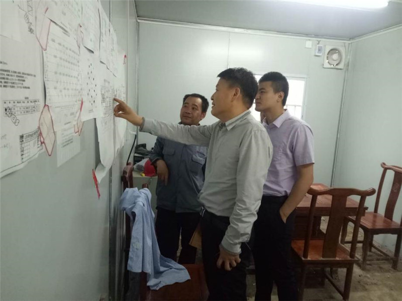 會(huì)談之后,宋總到施工現(xiàn)場考察指導(dǎo)高爐公輔項(xiàng)目及污水處理項(xiàng)目工作。在高爐公輔項(xiàng)目施工現(xiàn)場辦公室里,宋總對(duì)照著墻上張貼的項(xiàng)目進(jìn)度計(jì)劃及樁基平面圖,詳細(xì)了解項(xiàng)目的進(jìn)展情況,并在考察現(xiàn)場后,認(rèn)真聽取了項(xiàng)目部對(duì)施工進(jìn)度、質(zhì)量、安全管理的工作匯報(bào),宋總對(duì)項(xiàng)目部管理人員的辛勤工作表示了肯定,并針對(duì)工程難度大、樁基分包單位力量弱、價(jià)格低等存在的困難做出了部署。