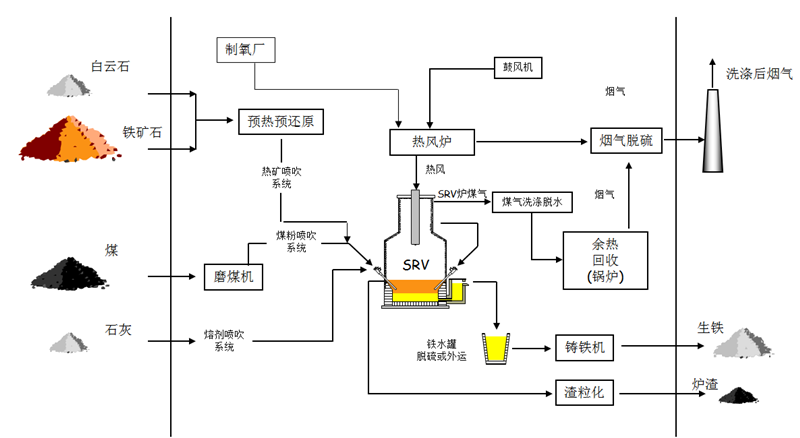 HIsmelt是一種直接熔融還原的煉鐵工藝,是典型的一步法熔融還原工藝。該工藝可直接熔煉經預熱處理的鐵礦粉和其他適合的含鐵原料,并噴吹煤粉作為系統的還原剤及熱量來源。HIsmelt工藝流程圖如下: