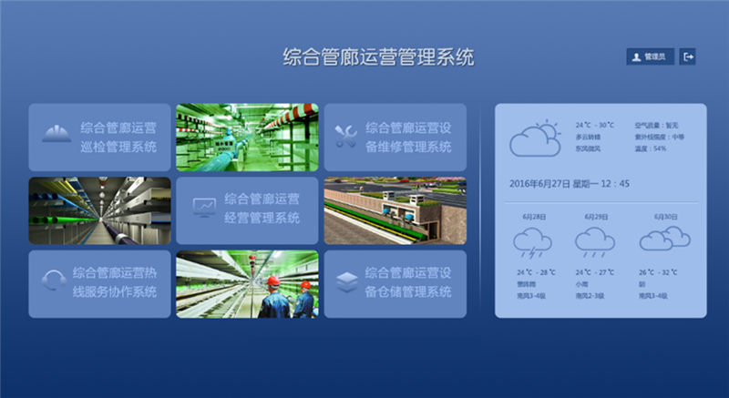 智慧管廊:以“知、控、警、決、管、營、享”為管理方針,以大數(shù)據(jù)、物聯(lián)網(wǎng)、云架構(gòu)、智能組態(tài)、綜合業(yè)務(wù)決策分析、人工智能等技術(shù)為支撐,結(jié)合城市地理信息系統(tǒng)(GIS)和建筑信息模型(BIM),通過整合各數(shù)據(jù)分析,構(gòu)建指揮統(tǒng)一、功能齊全、反應(yīng)靈敏、運轉(zhuǎn)高效的管廊運行綜合管理平臺,包括1個中心、1個平臺、7個應(yīng)用系統(tǒng)、N個終端,對綜合管廊內(nèi)環(huán)境、設(shè)備及運行進(jìn)行實時監(jiān)控、運營管理和安全預(yù)警,提高決策指揮效率,切實提高處置突發(fā)安全事件的能力,以保障系統(tǒng)安全、高效運行。